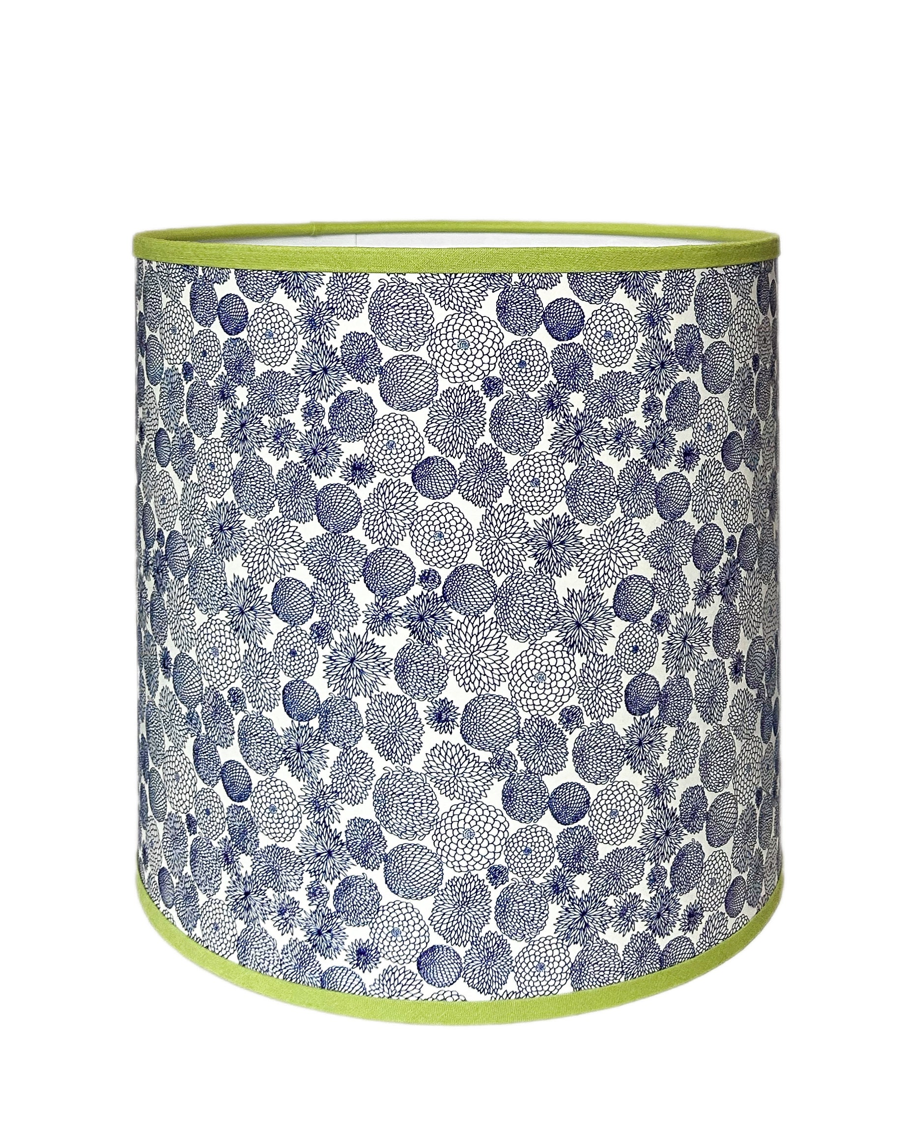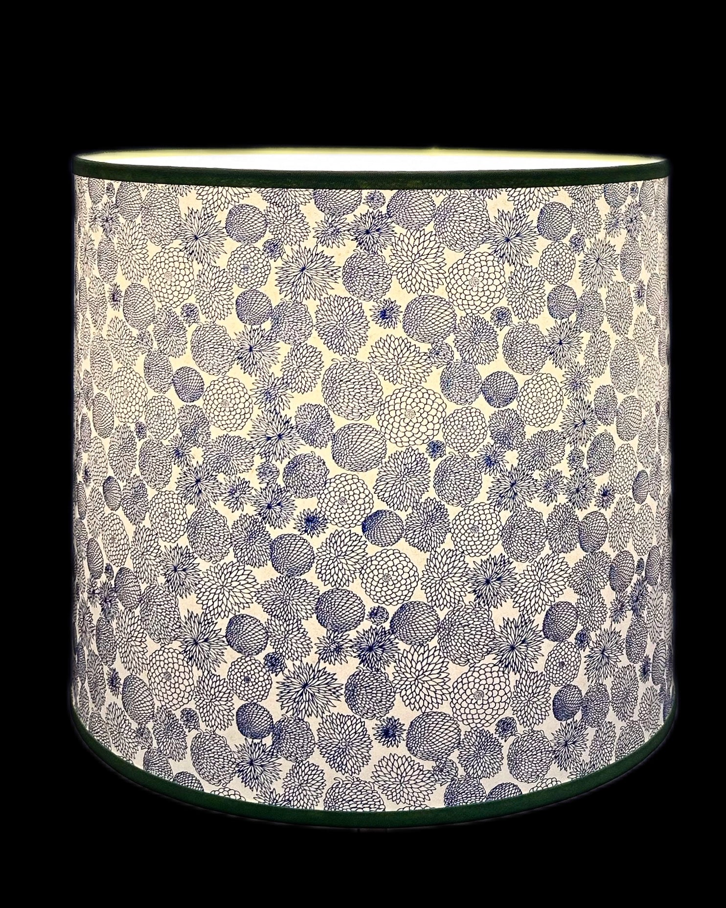 The Blue Chrysanthemums on White lampshades are crafted from exquisite Yuzen Washi paper, hand-dyed and silk-screened by artisans in Kyoto, Japan. Each pattern is scrupulously hand-printed in multiple layers of colour onto fine washi paper, which is traditionally processed by hand from mulberry bush fibers. The dyeing technique, using vibrant pigments, ensures colours that are both rich and resistant to fading.