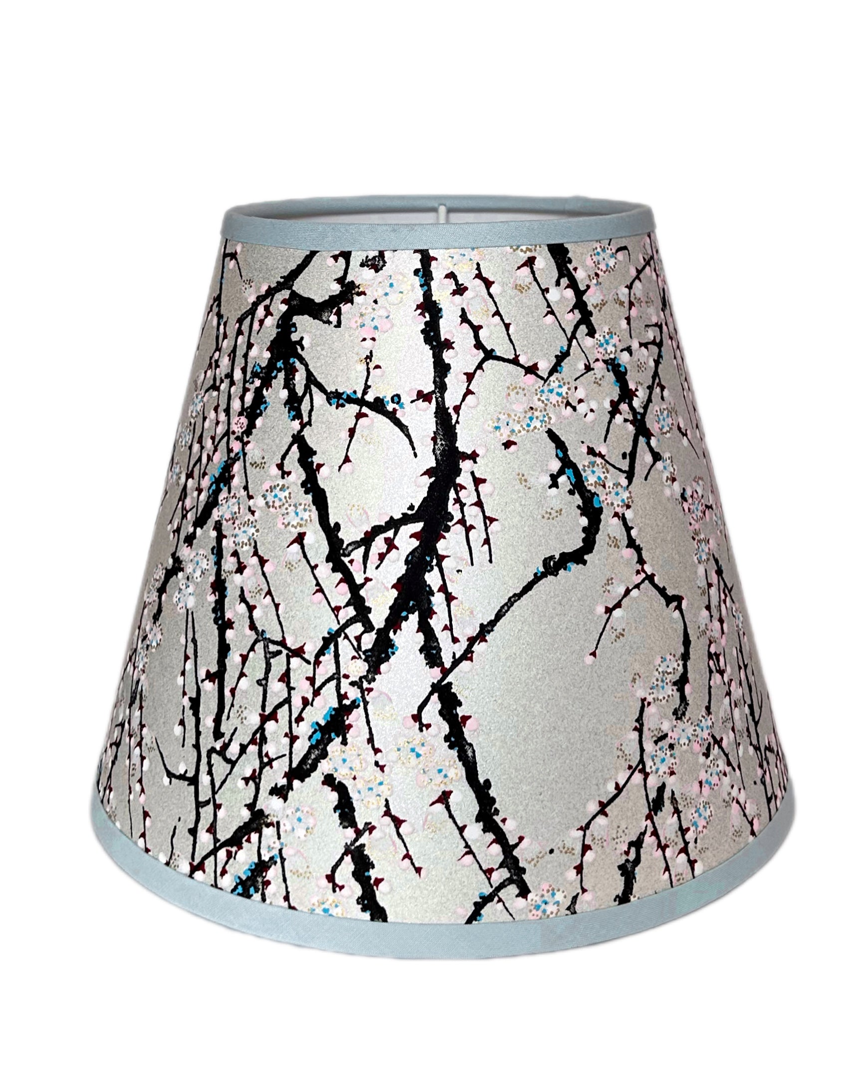 The Plum Buds in Silver lampshades are crafted from exquisite Yuzen Washi paper, hand-dyed and silk-screened by artisans in Kyoto, Japan. Each pattern is scrupulously hand-printed in multiple layers of colour onto fine washi paper, which is traditionally processed by hand from mulberry bush fibers. The dyeing technique, using vibrant pigments, ensures colours that are both rich and resistant to fading.